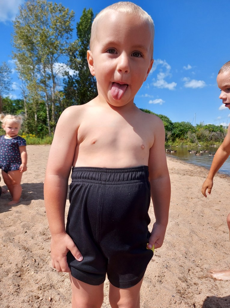 It was the long weekend in July and you were down by the dock with Daddy on the boat. Out of nowhere a hoard of wasps that had a nest hidden somewhere attacked you, stinging you both in the arm and you twice by the eye. After rushing to discover that I, in fact, did not have children’s Benadryl in my extensive first aid cupboard, I gave you a portion of an adult’s one and prayed your head wouldn’t swell up like a giant melon. ***Picturing something from Willy Wonka’s Chocolate Factory here*** After about 2 mins of crying and a short nap on my shoulder, you were raring to go again. Unlike Daddy whose arm looked like The Hulk’s minus the green. The next day we decided to go on a kayak ride and your brothers wanted to go explore “Pirate Island”, a small inlet in the lake. You, not wanting to be outdone by your brothers by any stretch, were game on. While they both kayaked back to the trailer to get some crocs on their feet, you scoffed at them and went ahead bare foot. I’ll never know how many sharp stones you stepped on, how many twigs got stuck between your toes, or if you stepped in any animal poop. All I know is when you emerged the other side belting your distinct warrior cry.