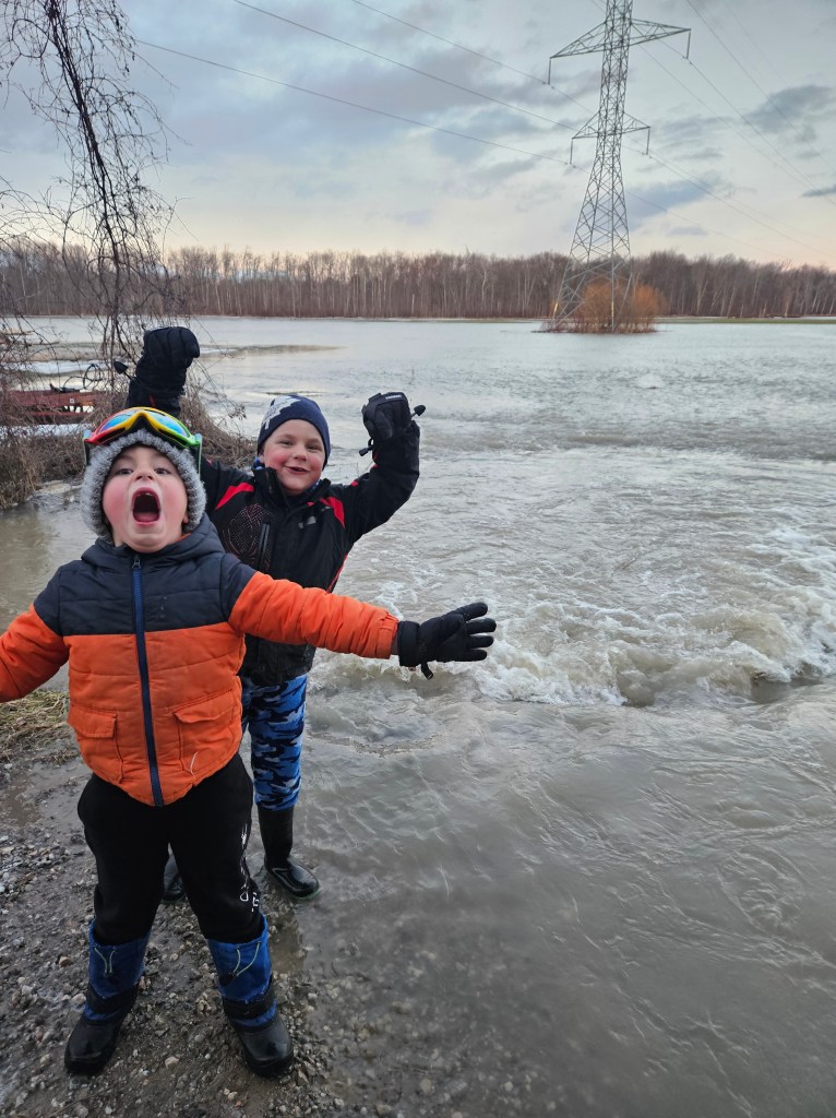 Recently our property flooded big time. The snow melted, the rain came and the river came out of the river. This was a stressful time for Daddy as he worked day and night trying to keep the water from coming into the house. This was a stressful time for Mommy as she worked day and night trying to keep you boys from drowning in the Oh-So-Tempting-Puddles (actual small ponds that were 8ft deep) in our front yard. Within a span of 24 hours I think I dried out your boots at least 14 times and I have no idea how many socks, pairs of pants and mitts we went through. Either way, your love for the outdoors warms my heart and works my washing machine.