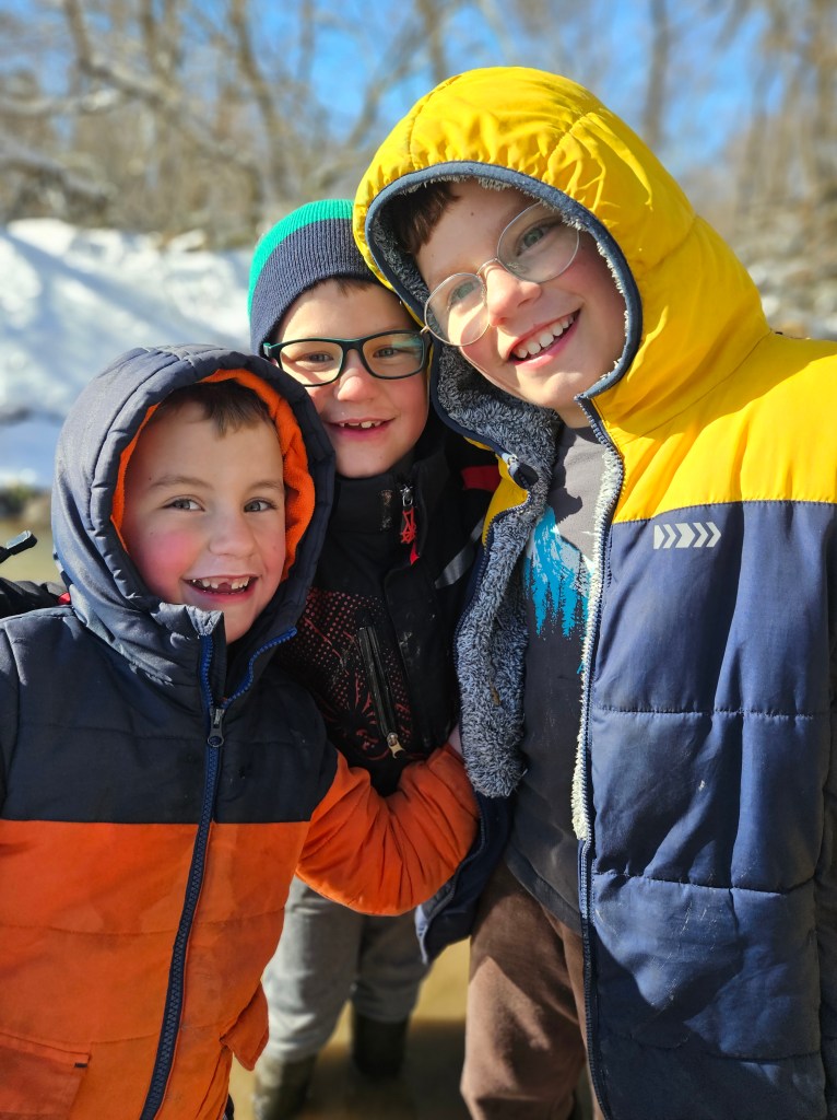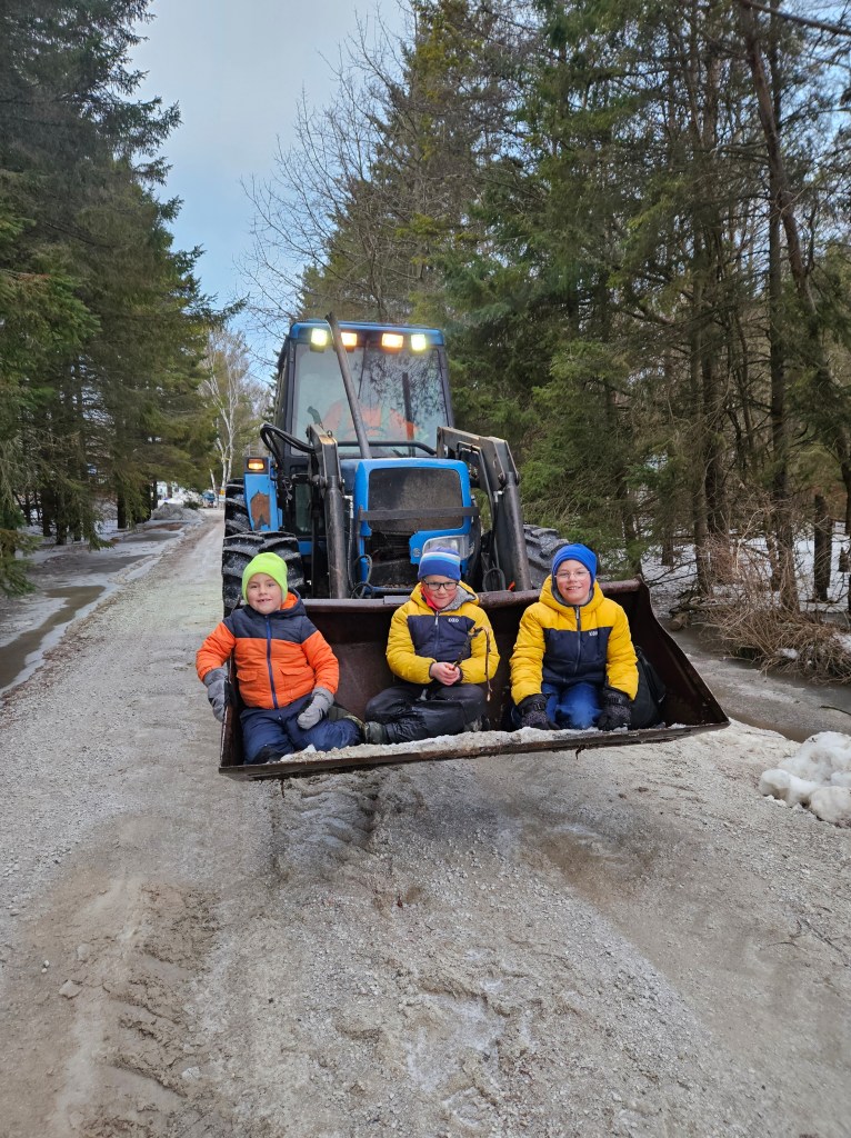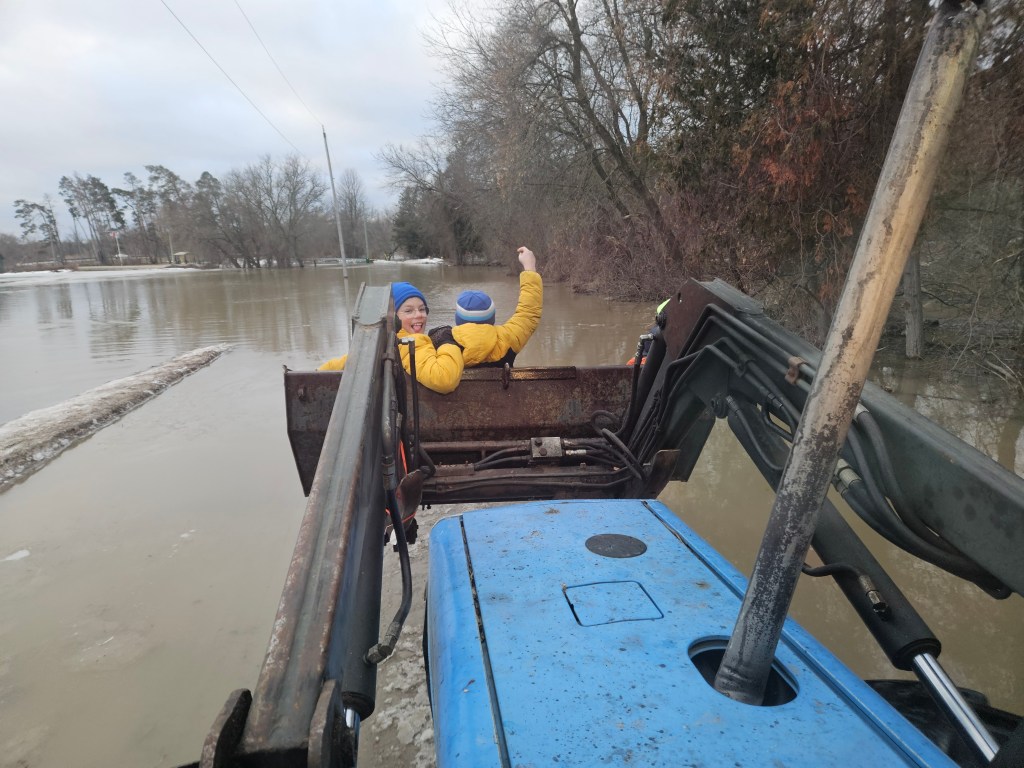 On the day where the river peaked it’s highest, it washed away the road in front of the house. At this point no “normal” vehicles (even Mommy’s super-mini-van-mom-mobile) could get through at this part or further down where the water had risen high over the road. Because this wasn’t our first flooding rodeo, we had parked some vehicles at the end of the road so that we had options provided we could get there (kayak anyone?). So the day the road disappeared into the abyss, we had one option left to get you boys to school, the tractor. And trust me boys, if there’s one thing I am dedicated in doing, it’s getting you to school for the day. Thanks to Daddy and “Blueberry”, you got to school, on time. I’m pretty sure everyone in the school heard about the amazingness of this venture and your positively heroic efforts in getting to school that day.